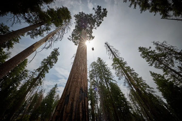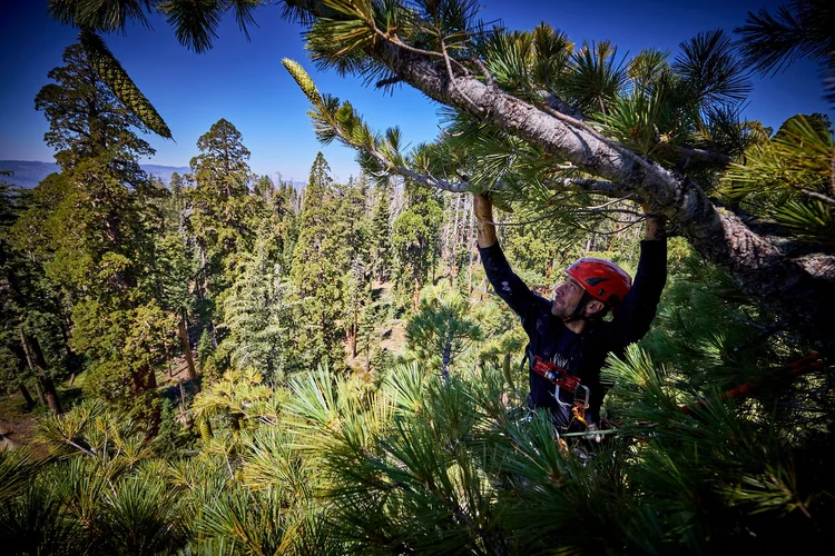 Ancient Forest Society climber in a sugar pine tree in Mariposa Grove, Yosemite National Park. Photo by Wendy Baxter